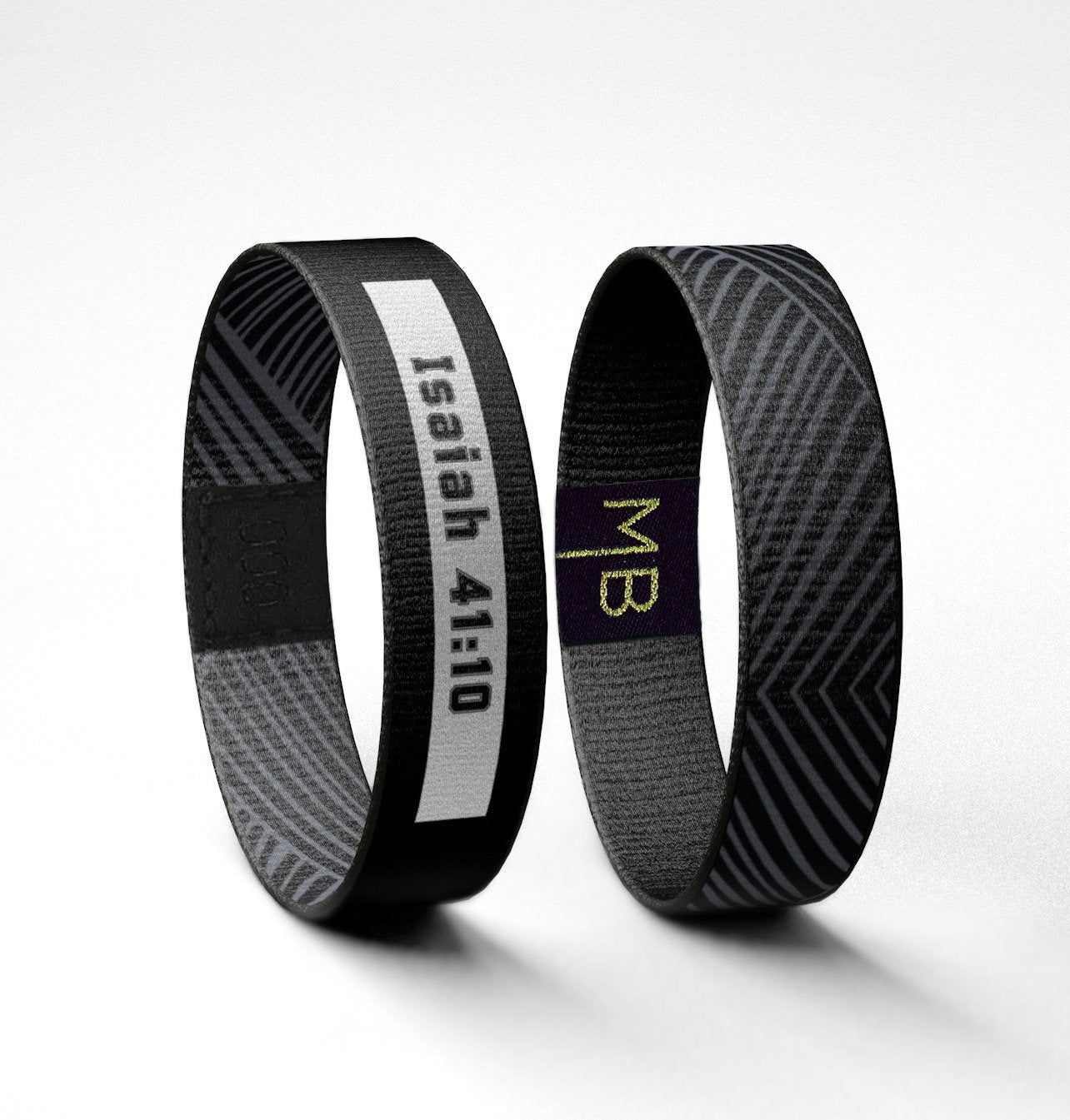 Isaiah 41:10: This Moxxie wristband is one of our more simple designs but most popular designs; still offering a bold bible verse. The solid black woven wristband features a white text box with a simple text design.