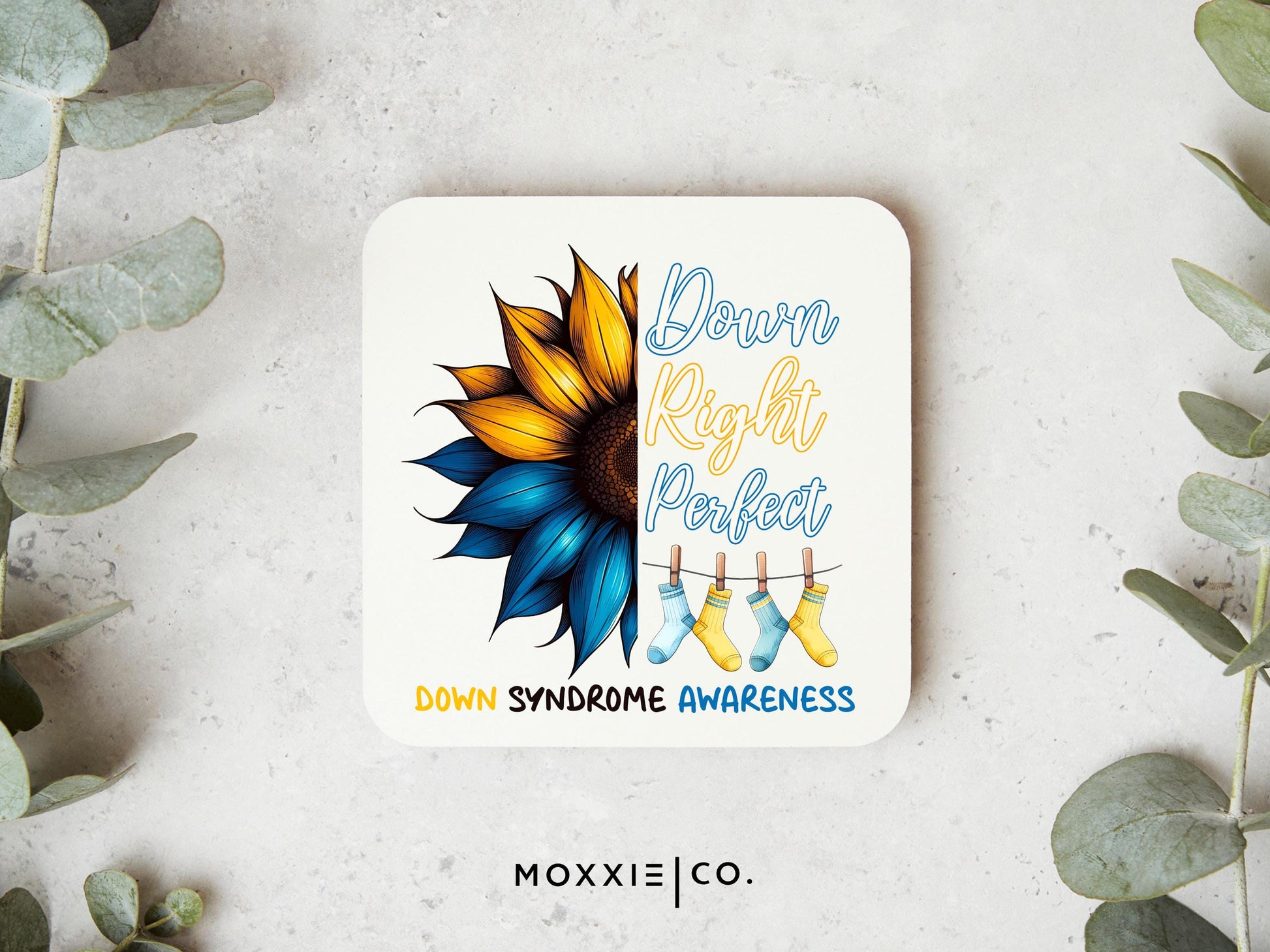 The design incorporates the empowering message "Down Right Perfect" along with colorful socks in shades of blue and yellow, representing the Down Syndrome awareness colors. This magnet not only celebrates uniqueness but also serves as an essential tool for spreading awareness about Down Syndrome.