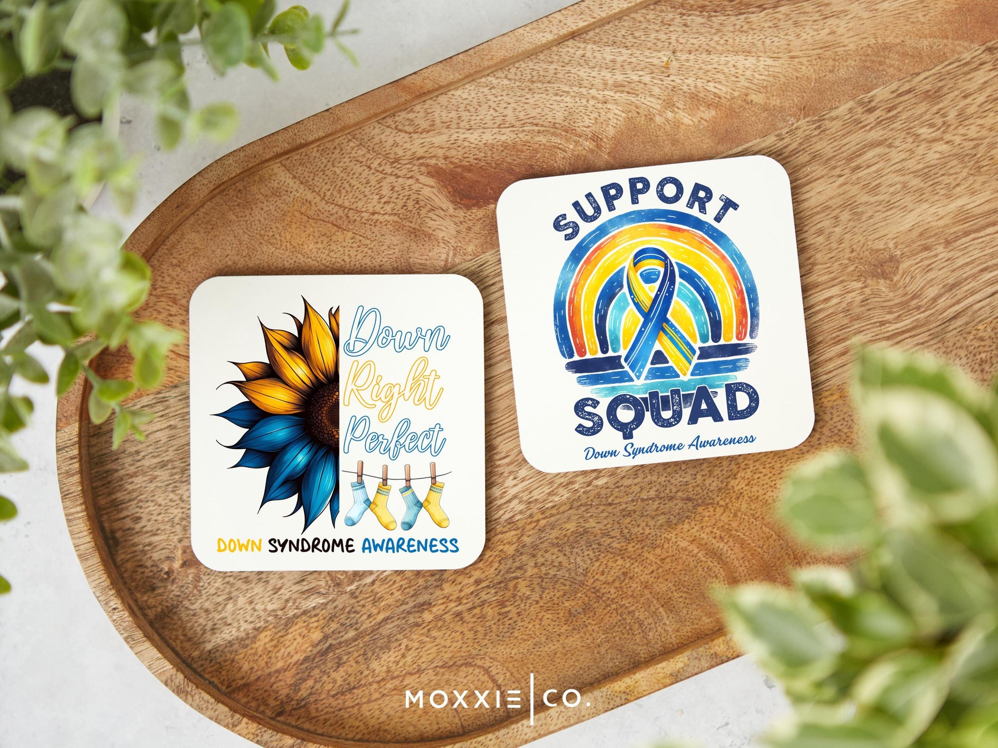 Celebrate the beauty of Down Syndrome with our "Down Right Perfect" motivational magnet. Featuring a vibrant sunflower design and adorable socks hanging on a clothesline, this 3" x 3" square magnet is a bright, cheerful reminder that every individual is perfect just the way they are.