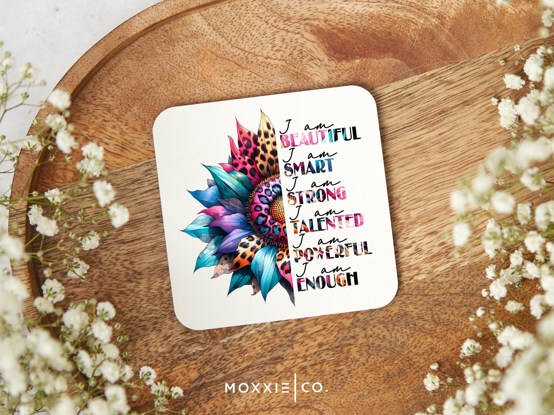 Embrace your inner strength and celebrate the power of positive affirmations with the "I Am Enough" magnet by Moxxie Co. Featuring a stunning blend of vibrant colors and intricate floral design, this motivational magnet is a visual reminder of your worth. Each bold affirmation—"I am Beautiful, I am Smart, I am Strong, I am Talented, I am Powerful, I am Enough"—is printed in a dynamic, colorful font that reflects the diversity of strength within us all.