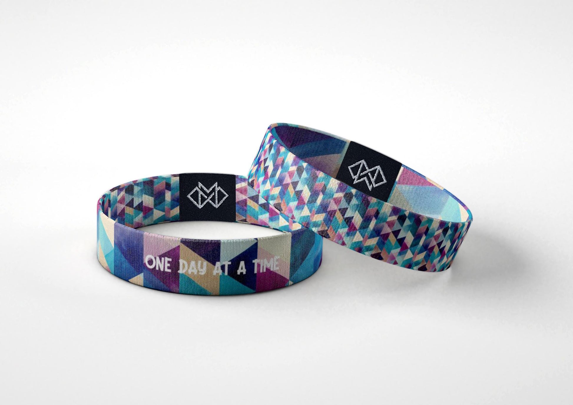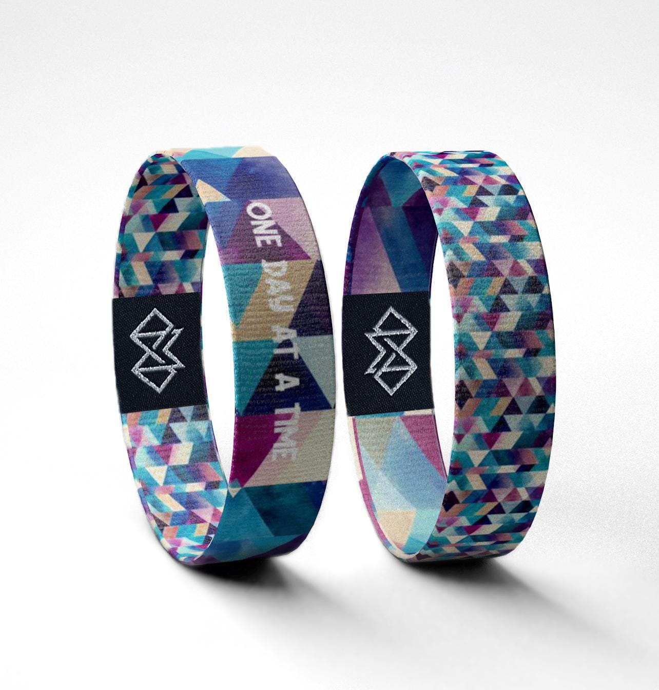 The “One Day at a Time” wristband is a reminder to breathe, take things step by step, and focus on the present. Featuring a vibrant geometric triangle design in shades of blue, teal, and purple, this reversible MoxxieBand carries the phrase “ONE DAY AT A TIME” on one side and a bold patterned design on the other, paired with our signature logo.