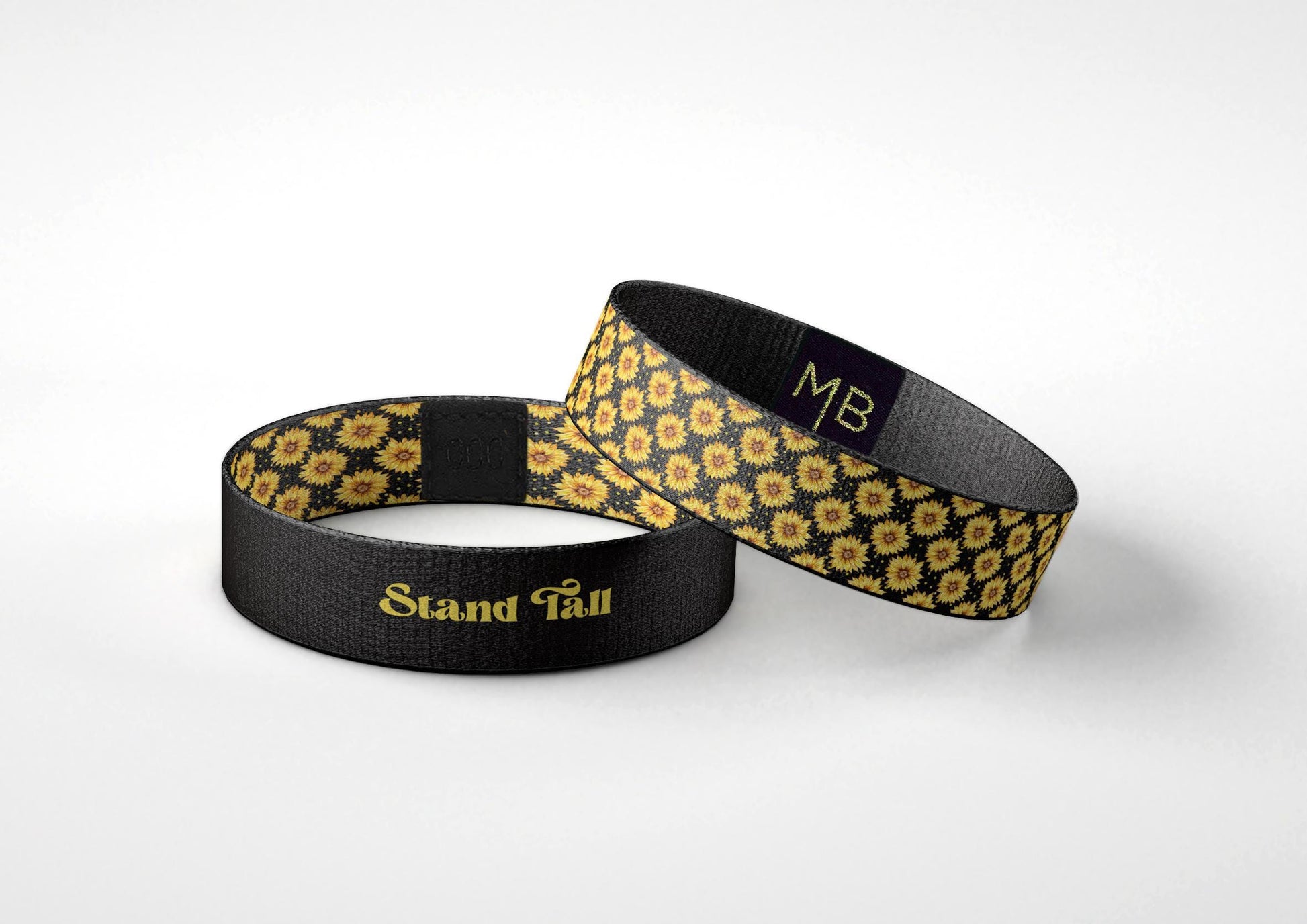 This band is black with sunflower design on one side and Stand Tall retro text in yellow on the other.